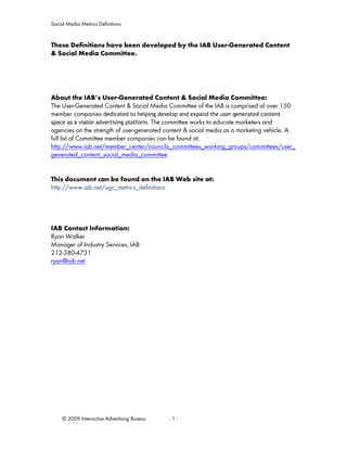 The document defines standard metrics for measuring social media advertising. It begins by explaining key terms like social media sites, blogs, and widgets/apps. It then provides categories and definitions for general social media metrics, blog metrics, and widget/app metrics. The document was created by the IAB's User-Generated Content & Social Media Committee to develop consistent reporting of metrics across the social media space and encourage growth.