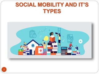 The document presents an overview of social mobility and its five types: horizontal, vertical (upward and downward), inter-generational, intra-generational, and occupational mobility. Defined by various scholars, social mobility describes the movement of individuals within societal structures, reflecting changes in social position over time. The conclusion emphasizes that understanding mobility requires a temporal perspective, as all types are interconnected and do not exclude others.