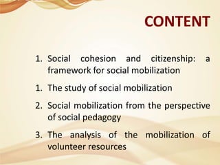 This document discusses social mobilization for social inclusion. It defines social cohesion as the ability of a society to successfully manage relations between individuals and groups. Social cohesion is a shared responsibility of public, private, third and informal sectors through active citizenship. The study of social mobilization has shifted from class struggle to social movements focused on organization, identity, resources and exclusion. From a social pedagogy perspective, social mobilization results from communication between mobilizers and mobilized to increase awareness of needs and opportunities. Volunteering mobilizes resources like time, skills and money, and volunteers receive knowledge, relationships and experience in return. Achieving social inclusion requires participation across all sectors through social mobilization strategies.