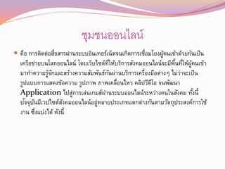 ชุมชนออนไลน์ คือ การติดต่อสือสารผ่านระบบอินเทอร์เน็ตจนเกิดการเชือมโยงผูคนเข้าด้วยกันเป็