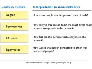 This document discusses social network analysis and its applications. It defines a social network as being composed of actors (people or groups) connected by social relationships. Social network analysis can be used to map these relationships visually using sociograms, understand information flow and community structure, and identify influential actors through metrics like centrality and betweenness. Tools like NodeXL and Gephi enable network extraction, visualization, and analysis to glean strategic insights from social networks.
