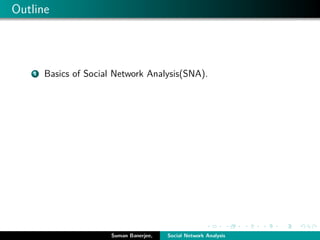 This document outlines topics in social network analysis presented by Suman Banerjee of IIT Kharagpur. It introduces basics of modeling social networks as graphs and outlines several research issues including community detection, link prediction, opinion dynamics, influence propagation, and stability analysis. It also lists some tools, journals, conferences, and top researchers in the field of social network analysis.