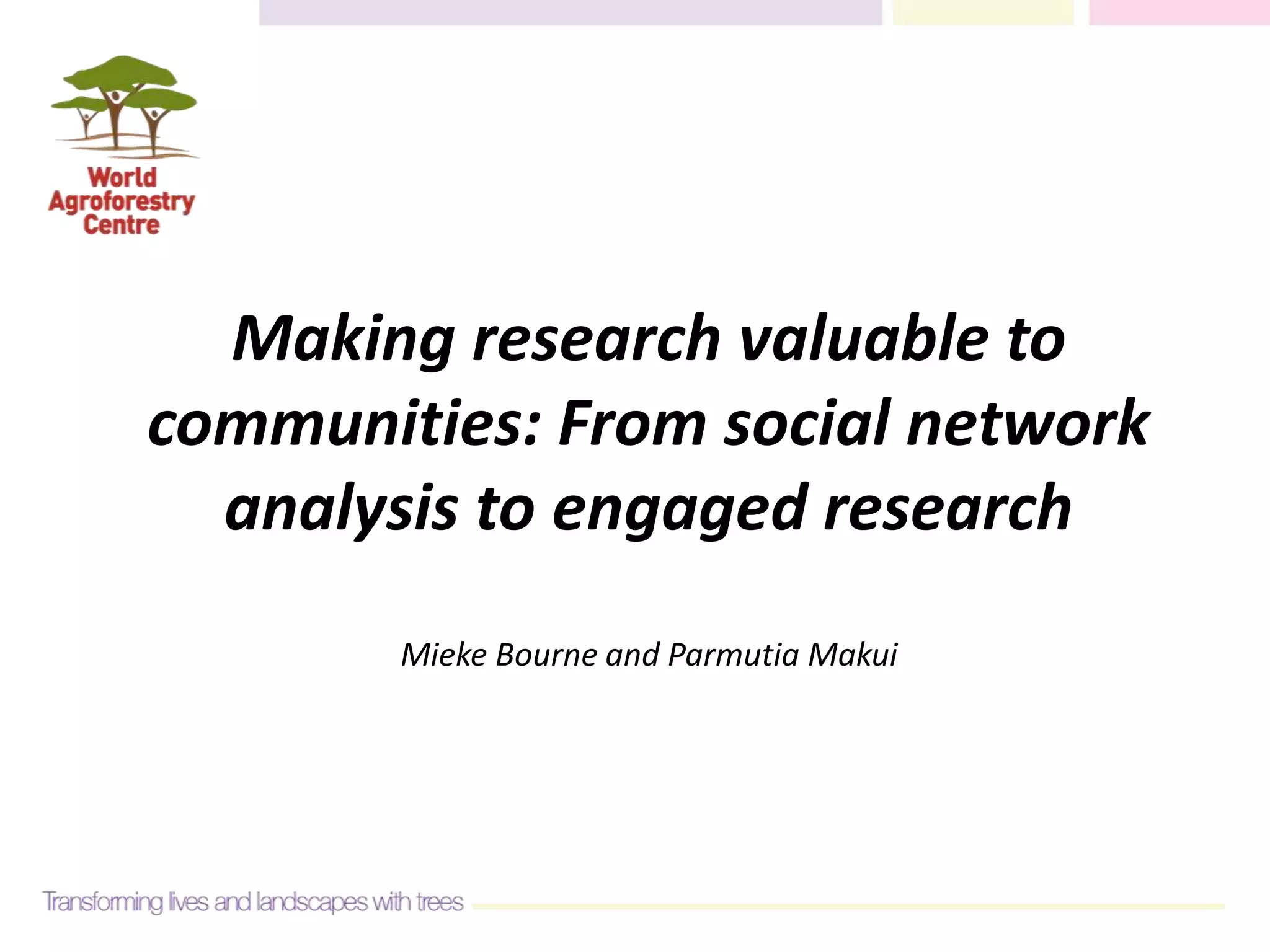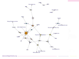 This document discusses social network analysis (SNA), a tool used to analyze social relationships and networks. SNA elicits, analyzes, and visualizes how actors interact and resources move through a network. It represents actors as nodes and their relationships as ties. The document provides examples of SNA's application in education, health, and agriculture. It outlines the process of conducting SNA through workshops or surveys to collect node attribute and tie/link data, which is then analyzed using software to visualize the network. The document suggests opportunities to further develop SNA, such as presenting networks back to communities and measuring social capital.