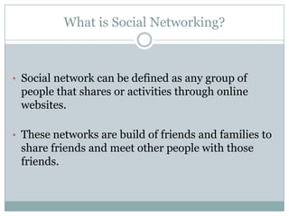 Social networking has grown tremendously since the rise of the internet. It allows people to connect with friends and family online and share updates and photos. While social media provides benefits like staying in touch and making new connections, it also poses risks to privacy and overuse can negatively impact school performance, work productivity, and sleep. Users must be aware of how to safely utilize social networks while minimizing disadvantages.