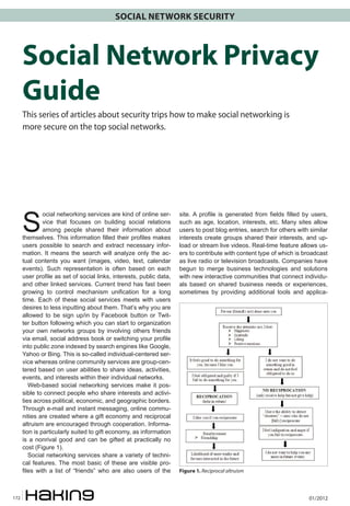 This document serves as a comprehensive guide on social network security and privacy, outlining various aspects of social networking services, including user profiles, privacy risks, and privacy settings. It discusses the importance of protecting personal information shared online and provides insights on how to navigate privacy settings across platforms like Facebook, Twitter, and LinkedIn. The report emphasizes the growing concerns over data privacy and offers recommendations for users to secure their online presence against potential breaches.