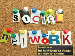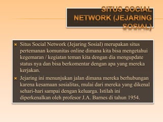 Dokumen ini membahas tentang situs jejaring sosial yang memungkinkan interaksi antara pengguna melalui berbagai fitur seperti chat dan video. Selain menjelaskan dampak positif, seperti media silaturahmi dan kampanye, dokumen ini juga mencatat dampak negatif berupa pengurangan perhatian terhadap keluarga dan risiko cyber crime. Sejarah jejaring sosial dimulai sejak tahun 1995 dengan perkembangan yang signifikan hingga saat ini.