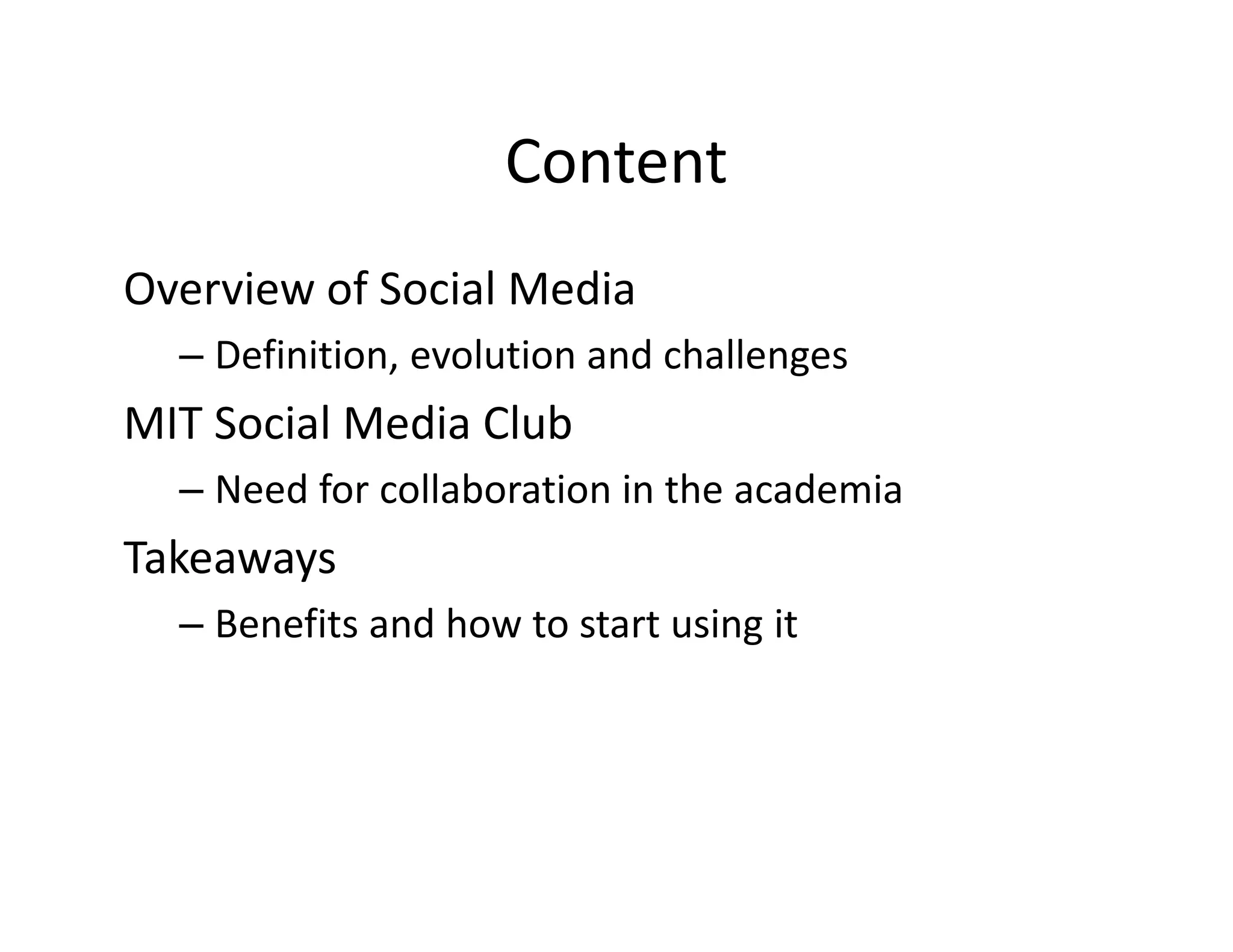 The document discusses the evolution and challenges of social media, highlighting its role in fostering collaboration within academia, specifically at MIT. It emphasizes the importance of social networks in influencing behaviors, enhancing productivity, and bridging communication gaps among diverse stakeholders. Additionally, it outlines the benefits of adopting social media tools for effective communication and decision-making in professional settings.