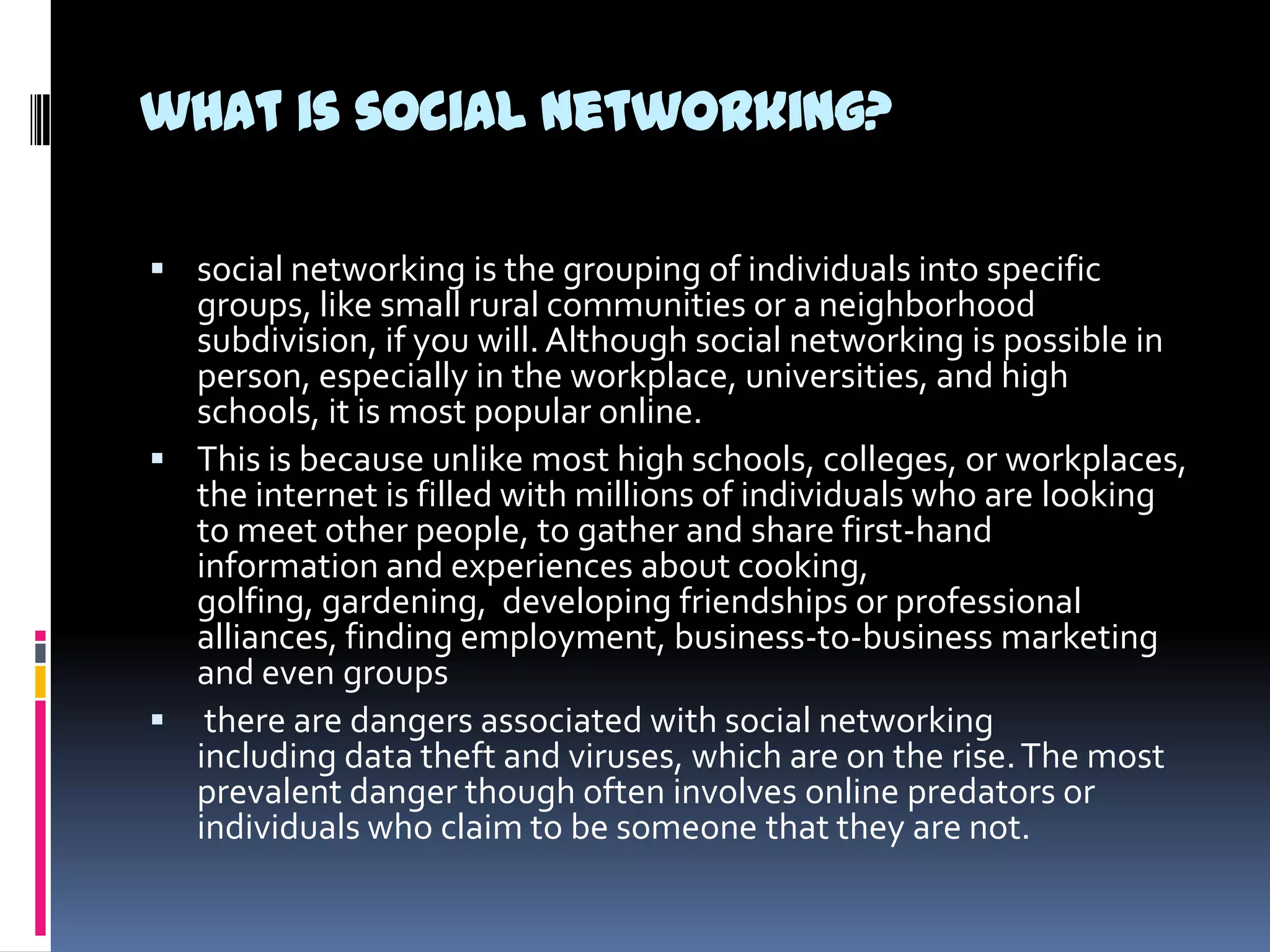 Social networking involves individuals grouping together online and offline into communities to share information and experiences. Popular social networking sites include Facebook, Twitter, and LinkedIn, which millions of users join to connect with others who share common interests. While social networking allows for convenient communication and relationship building, it also poses risks like data theft, online harassment, and overuse potentially leading to social isolation in the real world.