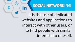 Social networking allows users to interact with others online through dedicated websites and applications. It enables users to share opinions, insights, information and experiences. Popular social networking sites include Facebook, Twitter, Instagram, LinkedIn and others. These sites help users stay connected with friends and family, share photos and videos, find people with similar interests, and meet new people online. However, some issues can arise from social networking like cyberbullying, cyberstalking, encounters with sexual predators, and uploading inappropriate content.