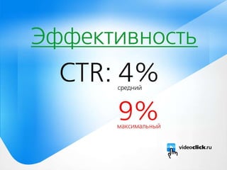 Чем обеспечена высокаяэффективность VideoClick? Прежде, чем потребитель сделает переход на сайт рекламодателя, он пройдет несколько «фильтров», которые позволяют оценить его принадлежность к ЦА и готовность получить информацию о продукте! Как это работает? 1 Подбор сайтов 2 Подбор слов 3 Показ видео 4 Переход на сайт 4 Ш а г а н а п у т и к э ф ф е к т и в н о с т и :
