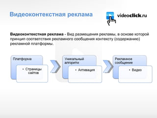 Видеоконтекстная реклама Видеоконтекстнаяреклама - Вид размещения рекламы, в основе которой принцип соответствия рекламного сообщения контексту (содержанию) рекламной платформы.