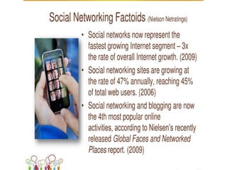The document discusses social networking sites and their evolution and use. It defines social networking sites as web-based services that allow users to construct a public profile, identify other users they are connected to, and view their connections. The document then traces the origins of social networking concepts back to ancient Greece and provides a history of developments in social network analysis in fields like psychology, anthropology and mathematics in the 1930s. It discusses current uses of social networking sites for communication, education, activism, professional networking and more. It also outlines advantages and disadvantages of social media use.