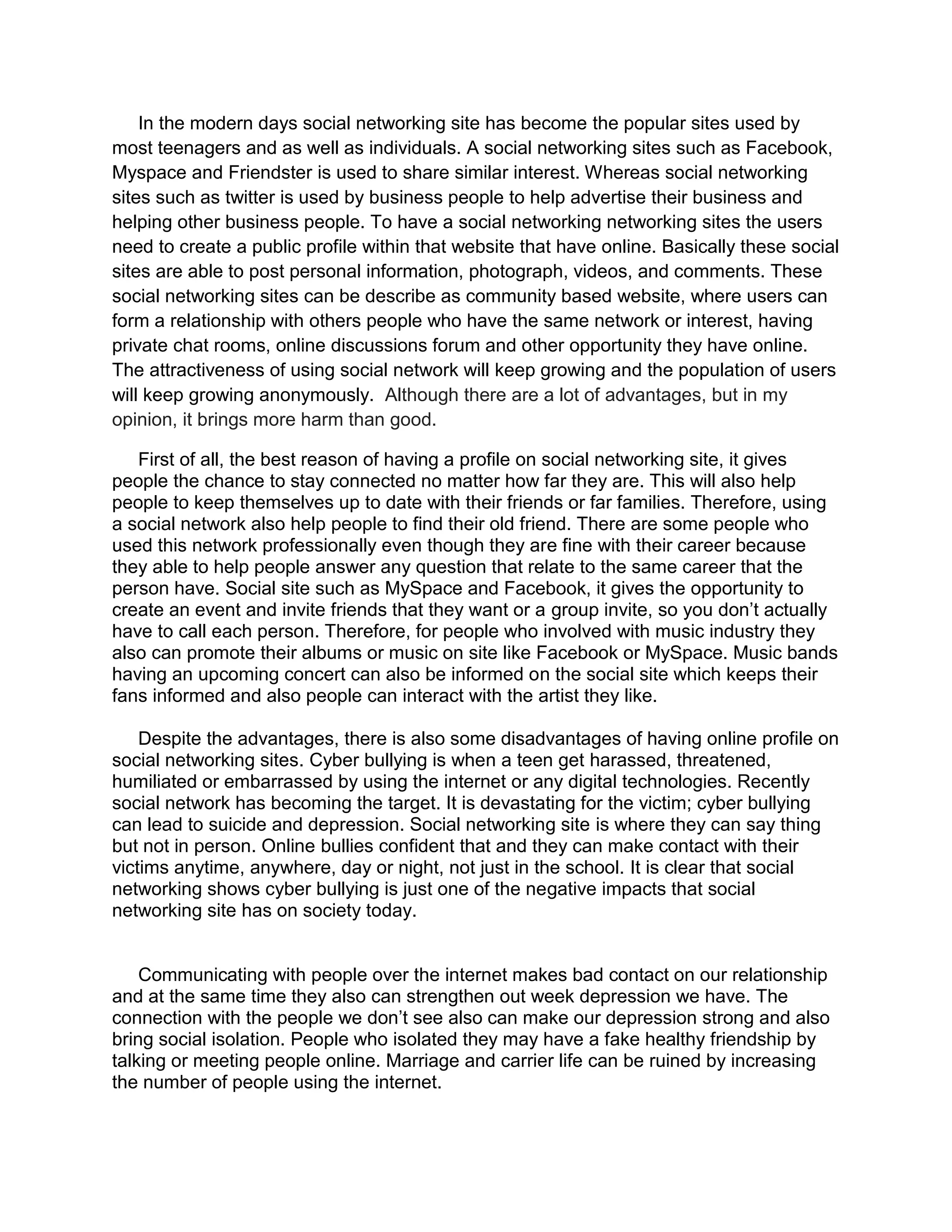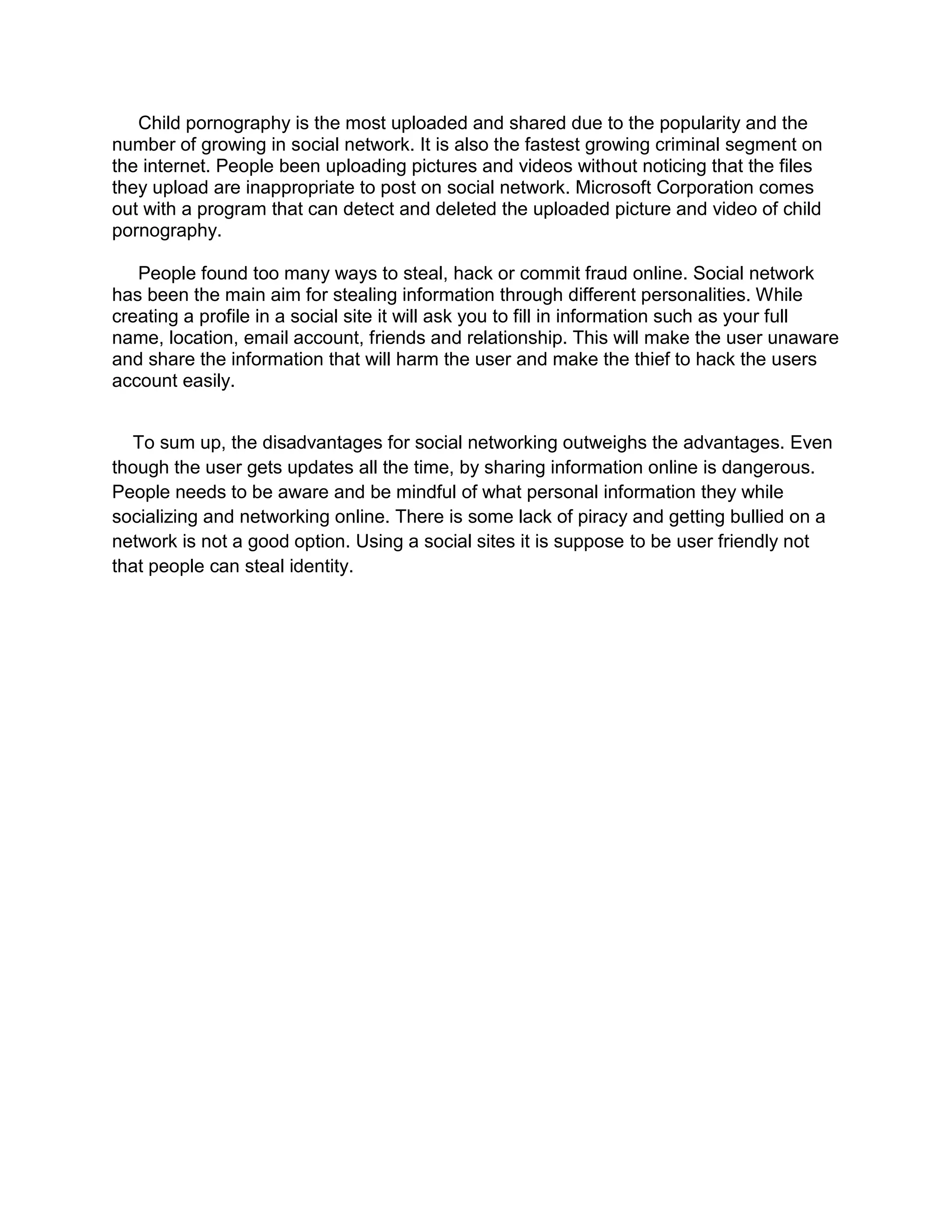 Social networking sites have become very popular among teenagers and individuals to connect with friends and share interests. However, social networking also enables cyberbullying, which can lead to depression and even suicide. It also increases the spread of child pornography and makes it easier for thieves to steal personal information by hacking users' accounts. While social networks allow people to stay connected and promote music or businesses, the disadvantages of privacy risks, identity theft, and negative mental health impacts outweigh the advantages of using them.