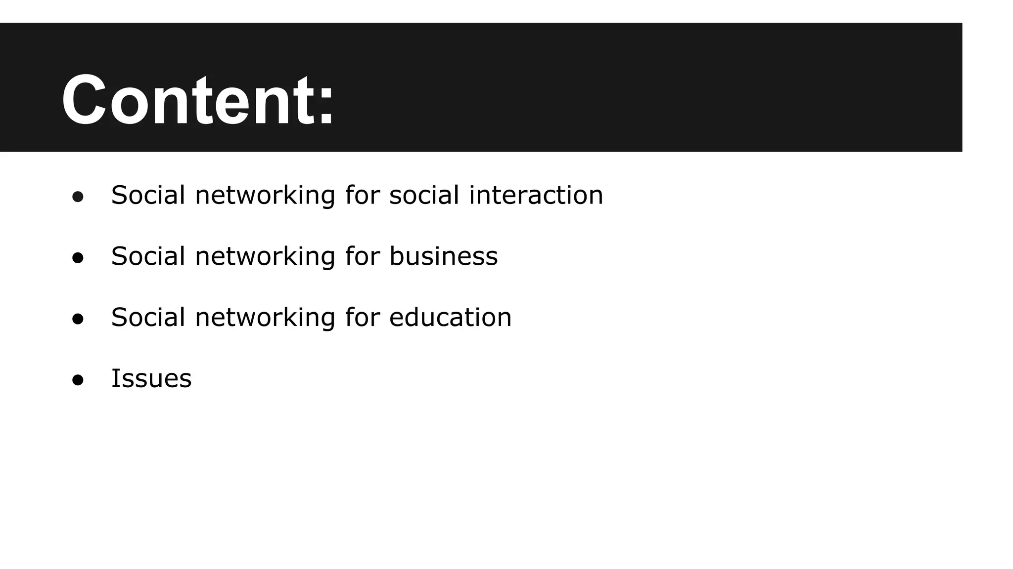 The document discusses social networking and its uses for social interaction, business, and education. It notes that social networking allows for virtual communities and duplication of face-to-face interaction. Businesses can use platforms like Facebook, Twitter, LinkedIn, YouTube, and Google+ to boost their brand and gain new customers. Educational social networks provide accessibility and flexibility in learning but can also enable negligence and unreliable information. The document outlines some issues with social networking like privacy concerns, spreading of rumors, and risks from interacting with strangers.