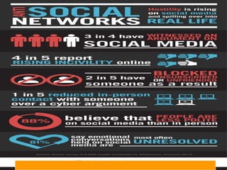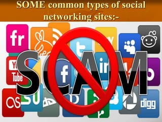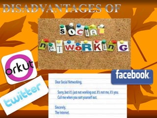 The document discusses some common types of social networking sites like Facebook, Twitter, LinkedIn, and their annual revenues. It then outlines some disadvantages of social networking sites like addiction, time wastage, lack of concentration, reduced learning and research capabilities, negative health effects, and reduced real-world social interaction. The document concludes by emphasizing the need to use social networking sites wisely in moderation.