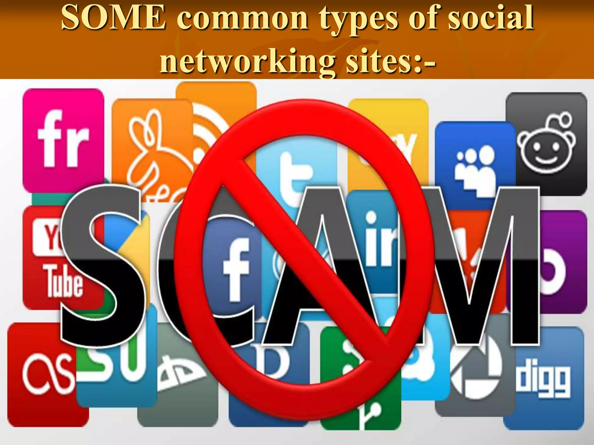 The document discusses some common types of social networking sites like Facebook, Twitter, LinkedIn, and their annual revenues. It then outlines some disadvantages of social networking sites like addiction, time wastage, lack of concentration, reduced learning and research capabilities, negative health effects, and reduced real-world social interaction. The document concludes by emphasizing the need to use social networking sites wisely in moderation.