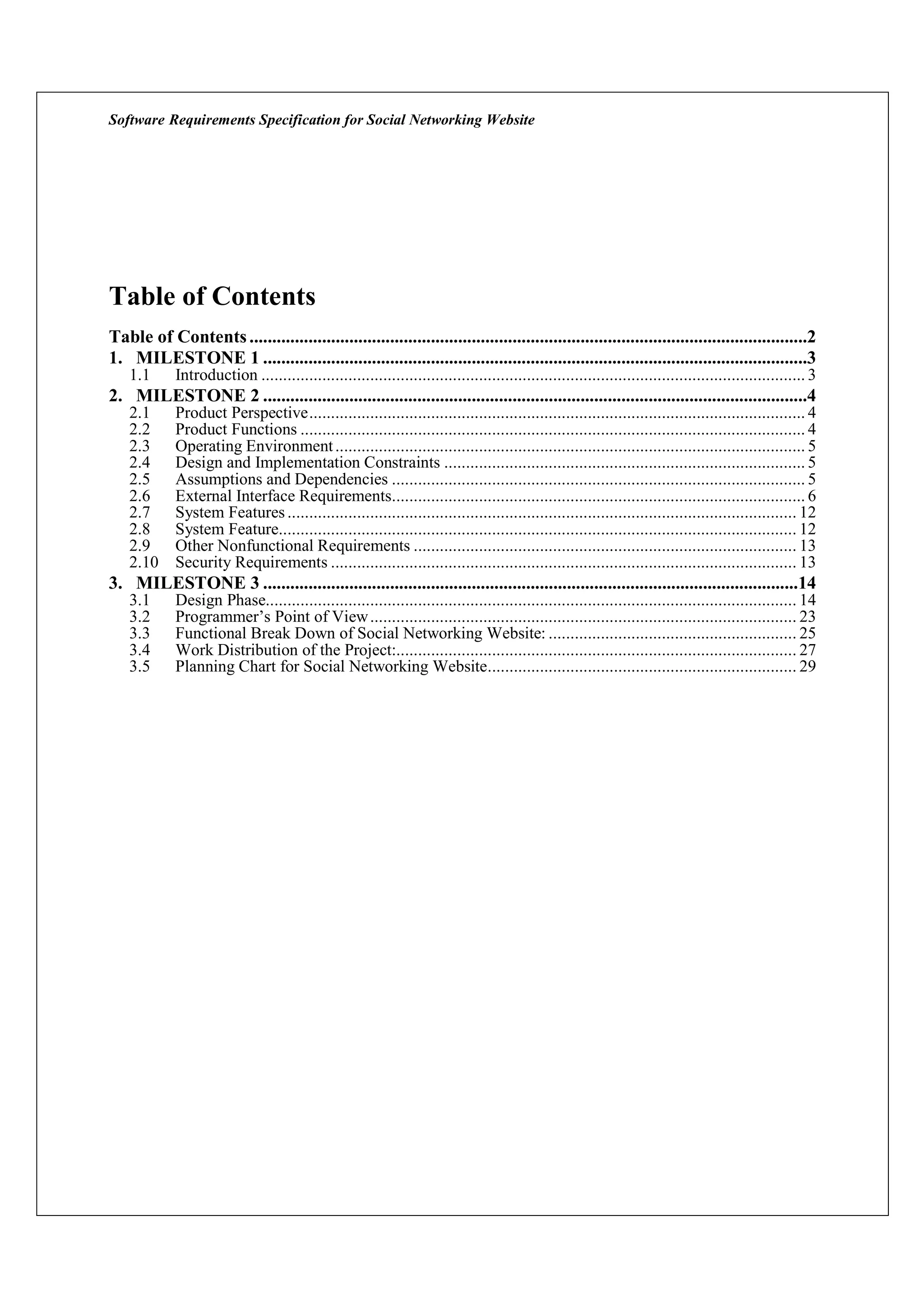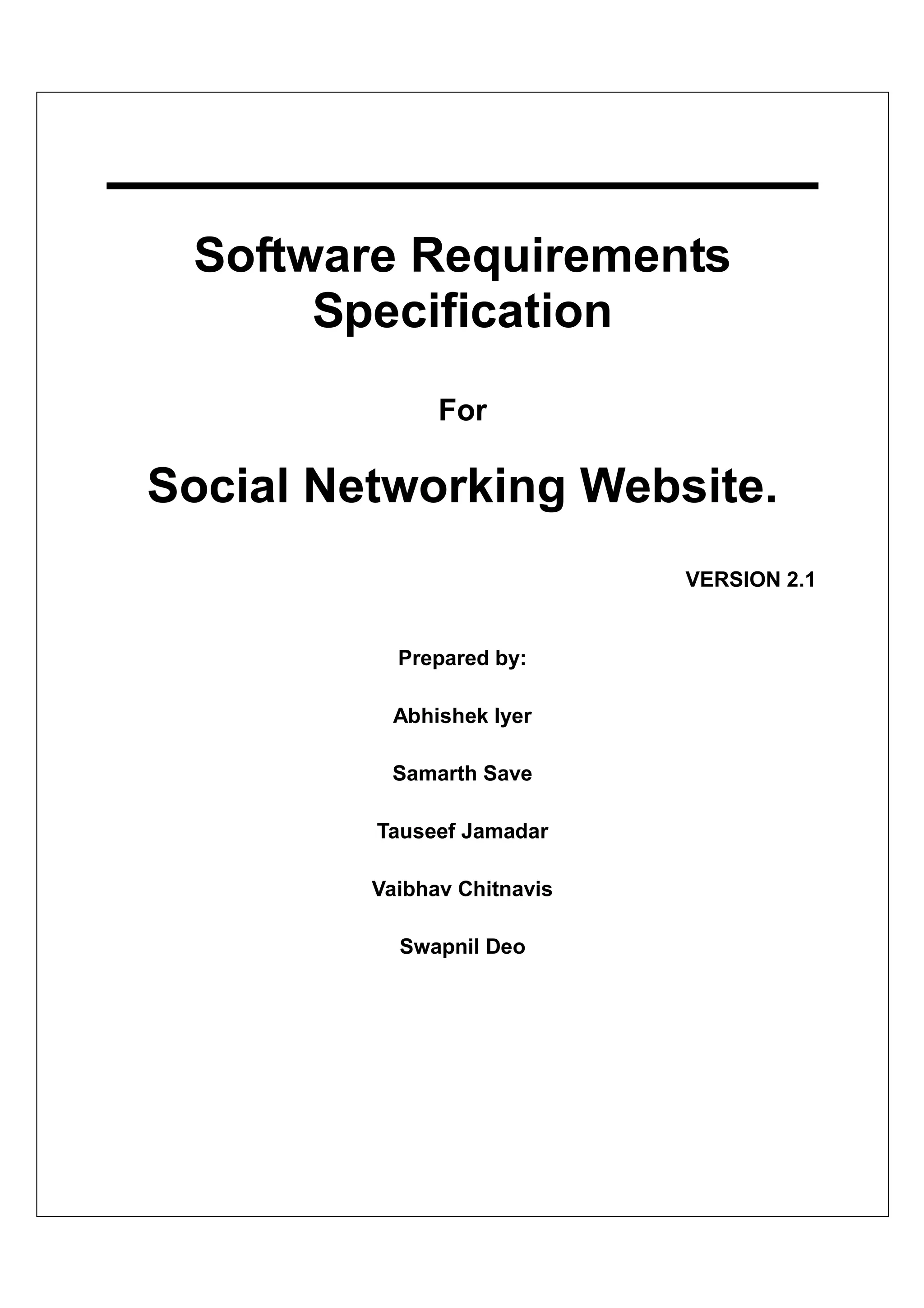 This document provides a software requirements specification for a social networking website. It contains 3 milestones that outline the purpose, functions, and design of the social networking site. Milestone 1 introduces the document and defines the product scope. Milestone 2 describes the product perspective, functions, operating environment, and interface requirements. It includes flow diagrams and interface designs. Milestone 3 covers the design phase, work distribution, and planning chart for the social networking website project. The document was prepared by 5 individuals and provides a requirements specification for developing a social media site.