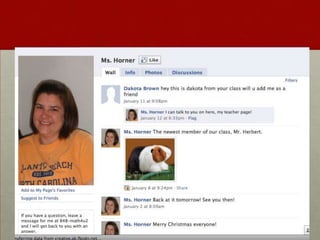 This document discusses the importance of educating students and parents about appropriate and safe use of social media like Facebook. It notes that students often lack awareness of privacy issues and the permanent nature of online posts. Employers now regularly screen candidates' social media, and inappropriate content can hurt job prospects. The document reviews Facebook's privacy policies and shares of user data with third parties. It argues schools must help students build positive digital footprints and social media experiences.