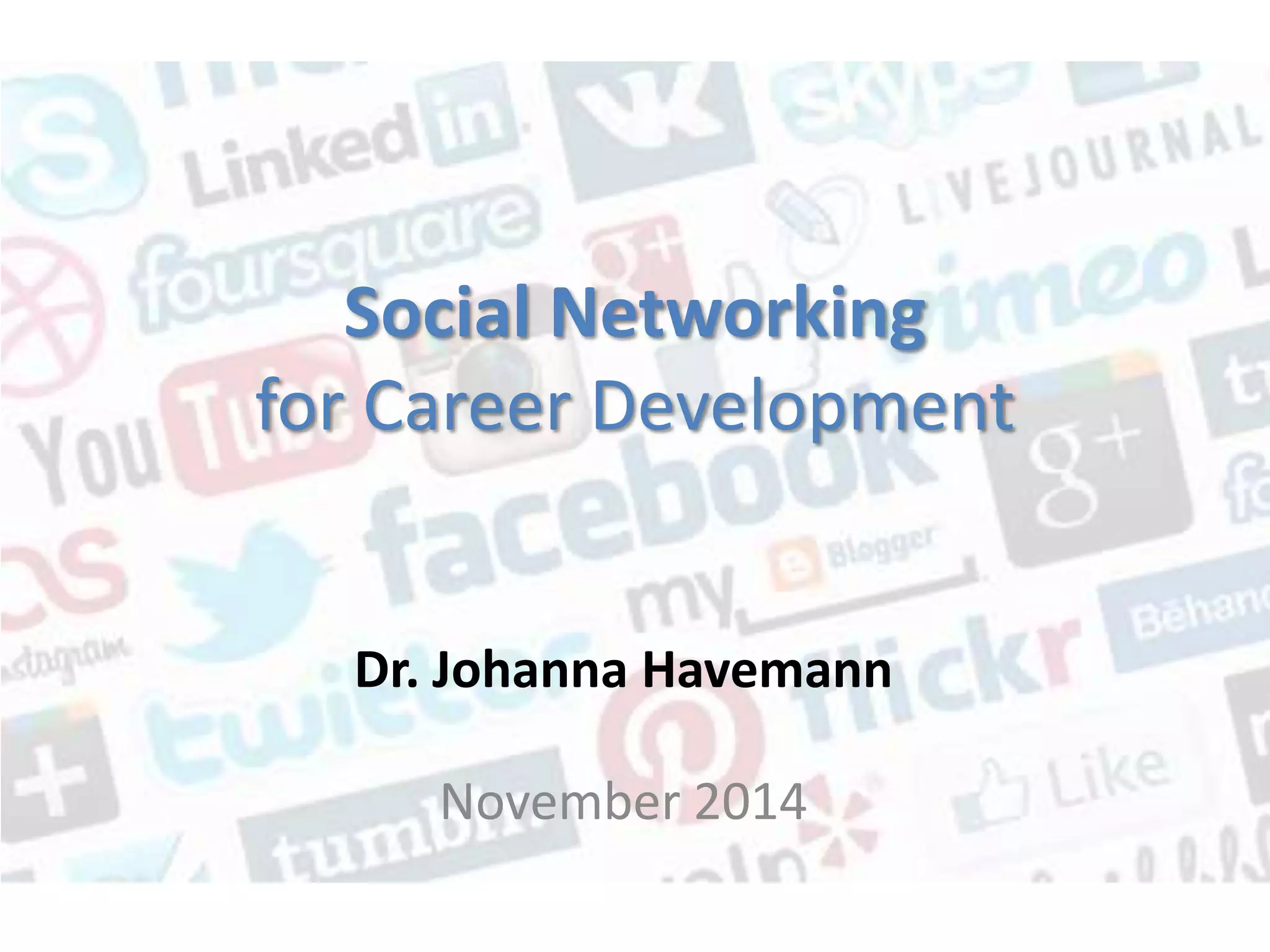 The document discusses the use of social networking platforms like LinkedIn and Xing for career development, providing insights on profile optimization, expanding business contacts, and maintaining professional conduct. It covers essential guidelines for effective networking, privacy management, and reputation management online. Additionally, it highlights the importance of engaging with one's network and providing value to connections.