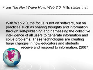 The document discusses how social networking tools like Facebook and Moodle can be used by educators for professional development and collaboration in the 21st century. It explains that Web 2.0 focuses on practices like sharing information and harnessing collective intelligence. Social networks promote communication among educators with similar goals. The Facebook group "e-Learning in Developing and Developed Countries" offers webinars and online courses on integrating technology for active learning. Classroom 2.0 is a Ning network that allows educators to connect, share content and resources, and participate in discussions and events online.
