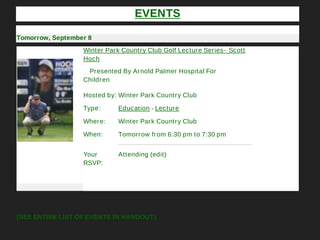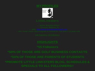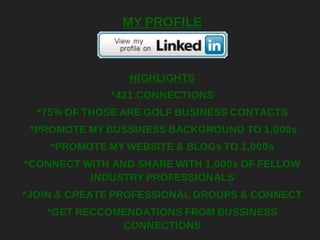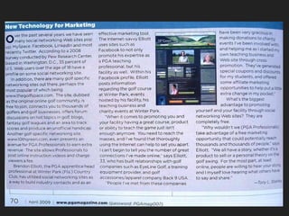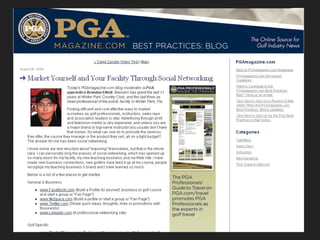 The document serves as a guide for PGA professionals on leveraging internet and social networking for business growth, emphasizing the importance of online presence through platforms like Facebook, Twitter, and LinkedIn. It highlights the significant use of social media in today's environment and encourages professionals to define their marketing targets and integrate various online tools to promote their facilities and personal branding. Key strategies include maintaining fresh content and linking profiles with websites and blogs.