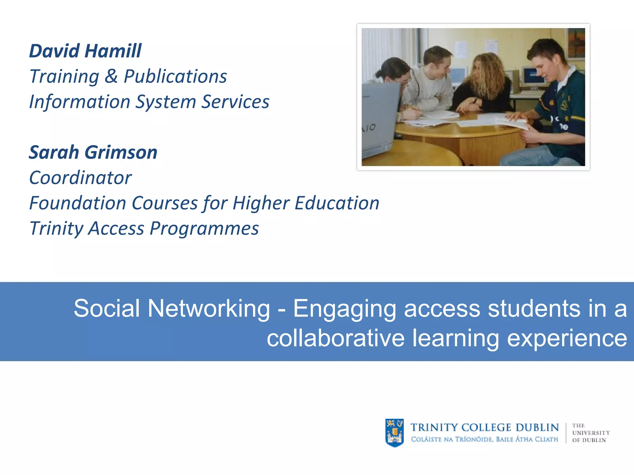 The document outlines the efforts of the Trinity Access Program (TAP) to enhance educational opportunities for socio-economically disadvantaged students through innovative approaches such as alternative admissions and collaborative learning via Web 2.0 tools. It highlights the success of TAP in increasing participation rates among non-traditional students and details the positive impact of using social networking platforms like Ning to foster engagement and community among learners. The study's findings indicate a high satisfaction rate among students regarding the effectiveness of these collaborative learning experiences in supporting their academic journey.