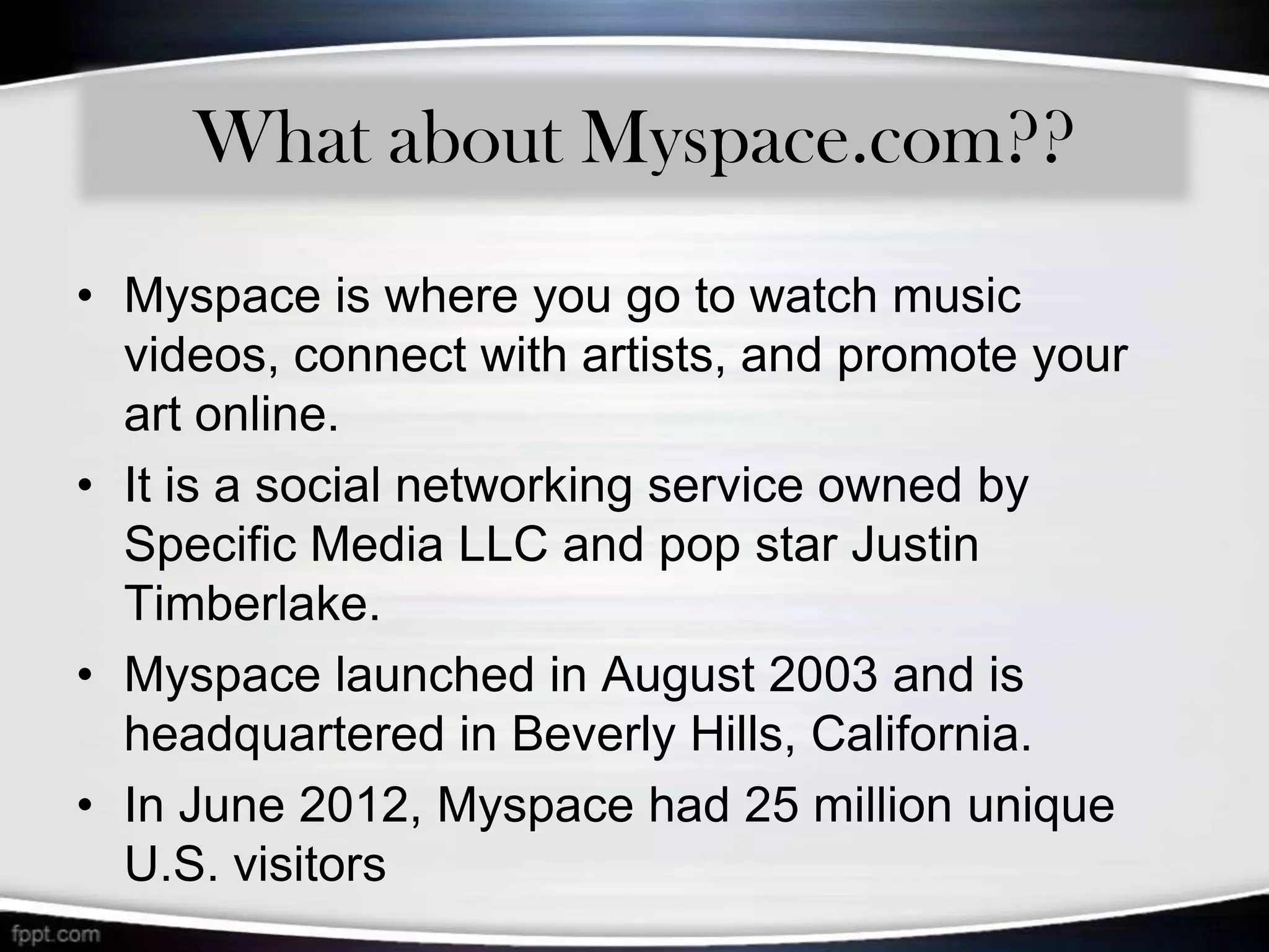 Myspace is a social networking service launched in 2003 that allows users to connect with artists, share media like music videos, and promote their work online. It provides features such as bulletins, instant messaging, video sharing, mobile access, news feeds, and polls. While Myspace is easy to use and customizable, it can also expose users to risks like fake profiles and stalking if not used carefully.