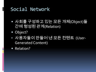 Social Network사회를 구성하고있는 모든 개체(Object)들 간에 형성된 관계(Relation)Object?사용자들이 만들어 낸 모든 컨텐트 (User-Generated Content)Relation? - 3.