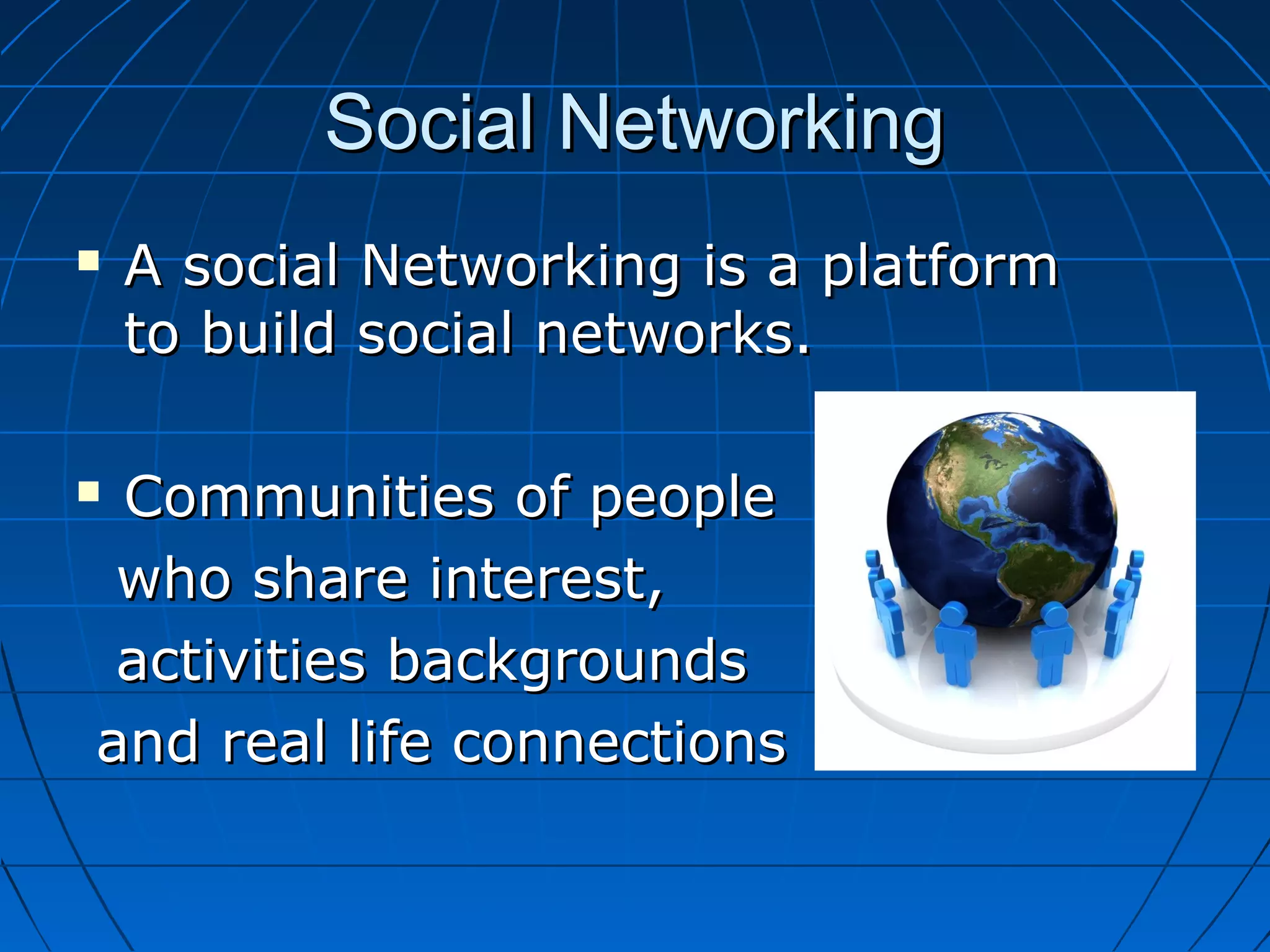 This document discusses social networking and defines it as a platform for building social networks and communities of people with shared interests. It provides examples of popular social networking sites like Facebook, Twitter, LinkedIn, and others. It outlines pros and cons of social networking, including how it allows maintaining relationships at low cost but can also result in privacy and fraud issues. Overall, social networking is transforming communication by enabling people to connect globally and share information online.