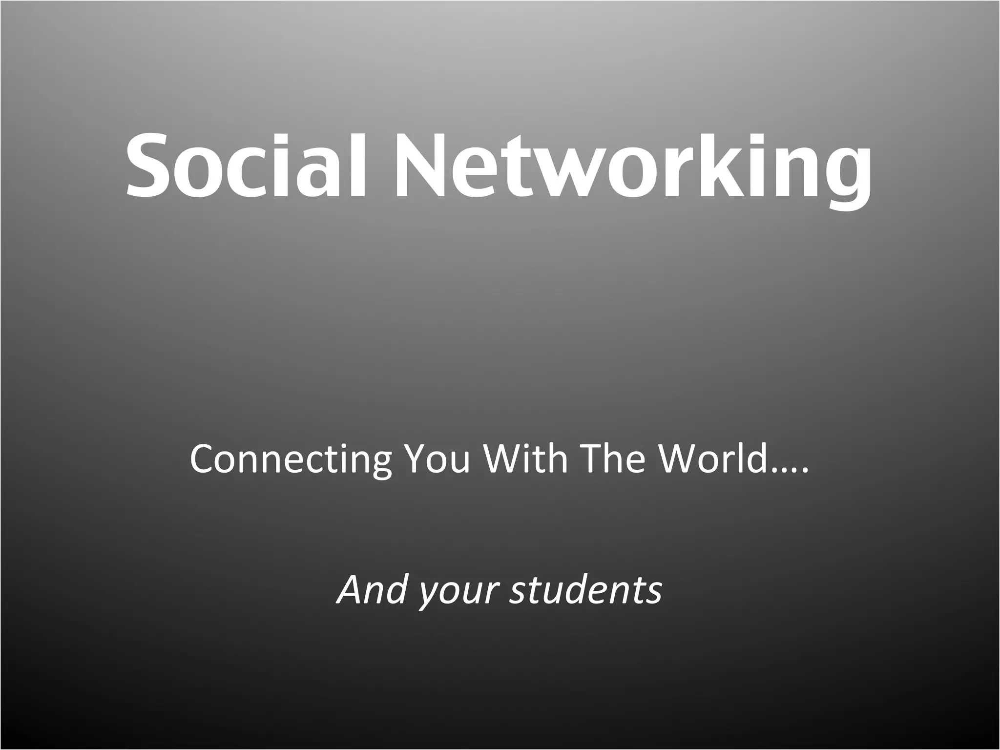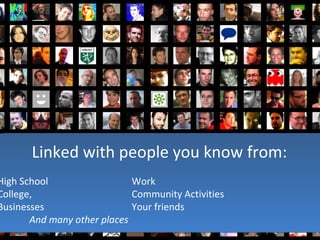This document discusses various types of social networks and how they connect users. It outlines categories like social networking sites, microblogging, professional networking, photo sharing, video sharing, audio networks, presentation sharing, bookmarking/research, and location-based networks. Examples are provided for popular sites in each category, with the largest being social networks like Facebook and Myspace that connect hundreds of millions of college students and those over age 50.