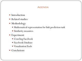 The document summarizes Svitlana Volkova's presentation on link prediction in social networks. The presentation covers: introducing link prediction and related studies; the methodology including mathematical representations and similarity measures; planned experiments crawling Facebook and using visualization tools; and conclusions on approaches to predicting previously unobserved links. Key approaches discussed are supervised vs. unsupervised methods, and similarity measures for node-wise link prediction.
