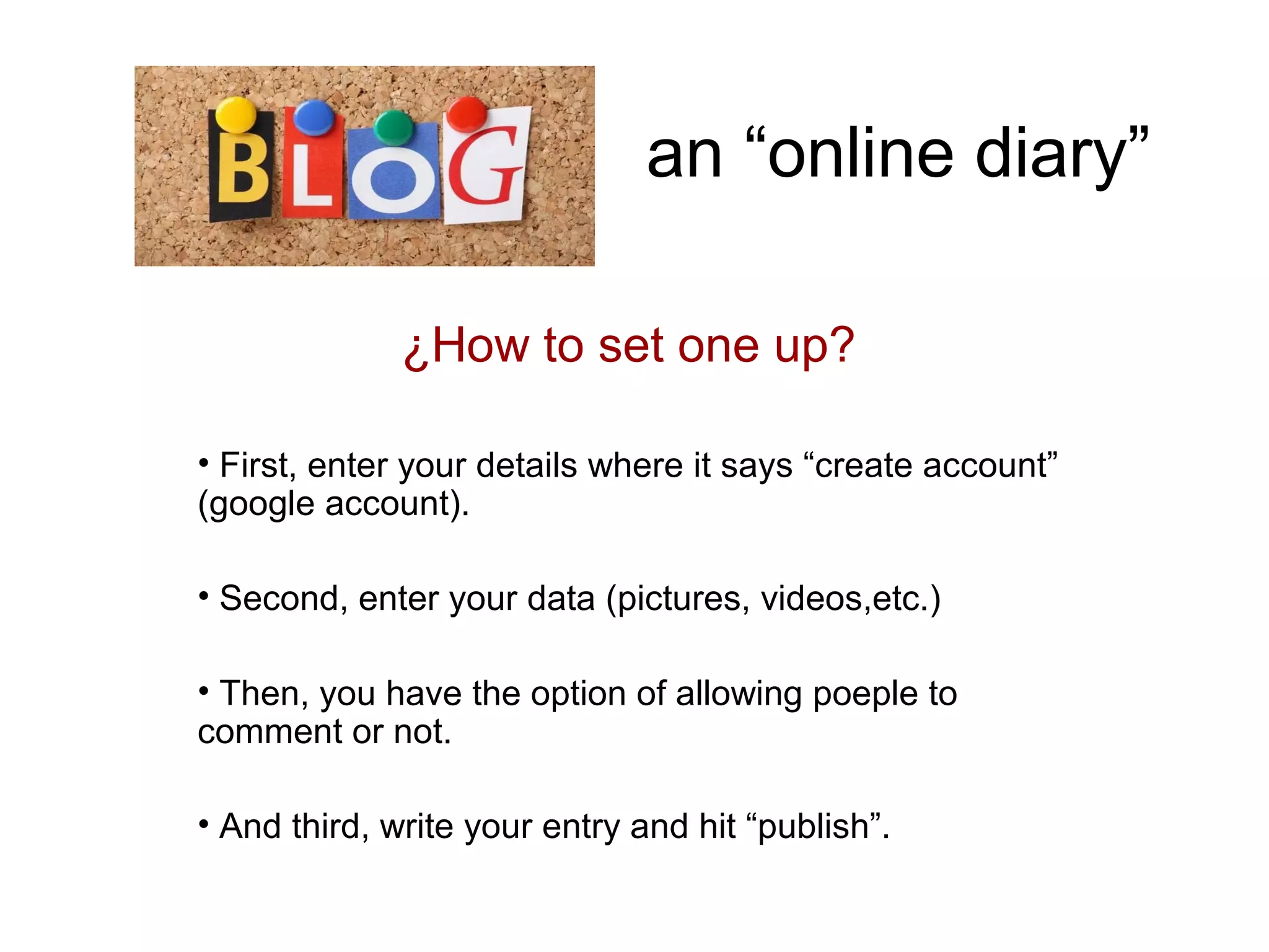 This document provides instructions for setting up an online diary and discusses social networking sites. It advises to use your own images and videos, write short lively sentences, and mention your subject often to get listed. Popular social networks discussed include Twitter for brief messaging, Facebook for longer updates and photos, LinkedIn for business, and Google+ for separating contacts into circles.