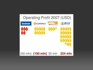 There are several myths about how social networks make money. In reality, many social networks are profitable through various revenue streams like advertising, selling digital goods, charging for premium memberships and services. While some networks have yet to make money, the opportunities for generating revenue from social networks are substantial and include areas like mobile applications, games, location-based services, e-commerce and enterprise solutions. A thriving ecosystem of supporting businesses is also emerging around social networks.