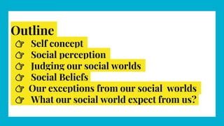 This document discusses social perception and related concepts. It begins by defining self-concept and how we perceive ourselves. It then discusses social perception, which is how we form impressions of others based on social cues. Key aspects of social perception discussed include social beliefs like customs and traditions that influence perceptions, how moods and judgments affect social perception, and the expectations societies have of individual roles and behaviors. The document aims to outline the important factors that shape an individual's social perception within a given community or culture.