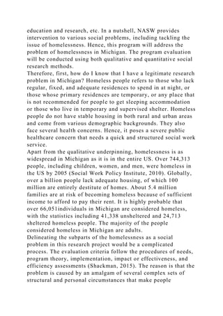 The National Association of Social Workers (NASW) is the largest professional social workers organization globally with over 130,000 members. It works to protect social workers, develop professional standards, and enhance well-being for people and communities through advocacy. NASW addresses various social problems like homelessness, HIV/AIDS, racism, and sexism. It conducts research and provides services for issues like homelessness in Michigan, which the summary will evaluate using qualitative and quantitative methods.