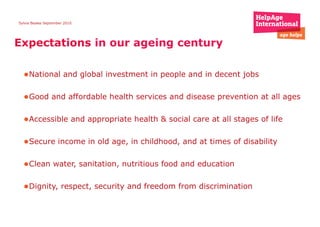 The document discusses the critical role of social protection in addressing poverty, inequality, and access to basic services in the developing world, particularly for vulnerable groups such as the elderly and children. It emphasizes the need for international advocacy, partnerships, and capacity building to implement effective social protection policies that promote social and economic sustainability. The document outlines recommendations for establishing comprehensive social security systems and highlights the importance of citizen engagement in shaping these policies.