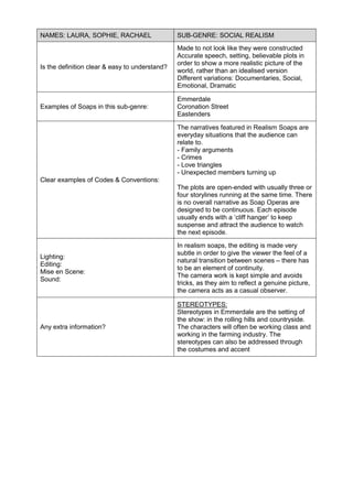 This document provides information about the soap opera sub-genre of social realism. It discusses conventions like using accurate speech, believable plots and settings to show a realistic picture of the world rather than an idealized version. Examples given of social realism soaps are Emmerdale, Coronation Street and Eastenders. The narratives feature everyday situations like family arguments, crimes, and love triangles. Plots are open-ended with multiple concurrent storylines and cliffhangers to keep viewers engaged. Editing and camera work aim to give a natural, casual feel like a genuine observation of reality rather than using tricks. Stereotypes may include working class characters and settings in the countryside and farming industry.