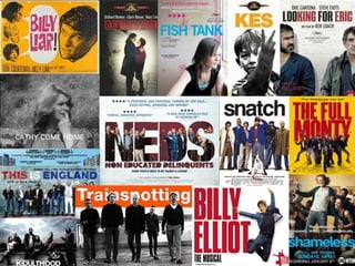 This document discusses the codes and conventions of social realist films. Some typical elements include working class characters, depictions of daily life, substance abuse, and exploring social issues through emotional stories of individuals overcoming adversity. Two examples given are the films "This is England", about UK skinheads in the 1980s, and "Billy Elliot", about a boy torn between his love of dance and family pressures. Both examples relate to the film "Verses" discussed in the document through their portrayals of working class culture and characters pursuing hidden passions.