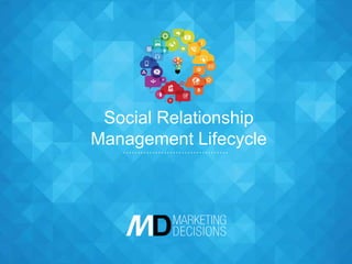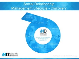 The document outlines a social relationship management lifecycle for marketing decisions. It describes a 5-step process: 1) Listen by identifying keywords and topics for social listening. 2) Learn by analyzing social conversations and sentiment trends. 3) Engage by responding to customers and labeling conversations. 4) Publish engaging content based on listening insights. 5) Analyze responses and track key performance indicators over time. The overall goal is to gain insights from social media to improve marketing strategies.