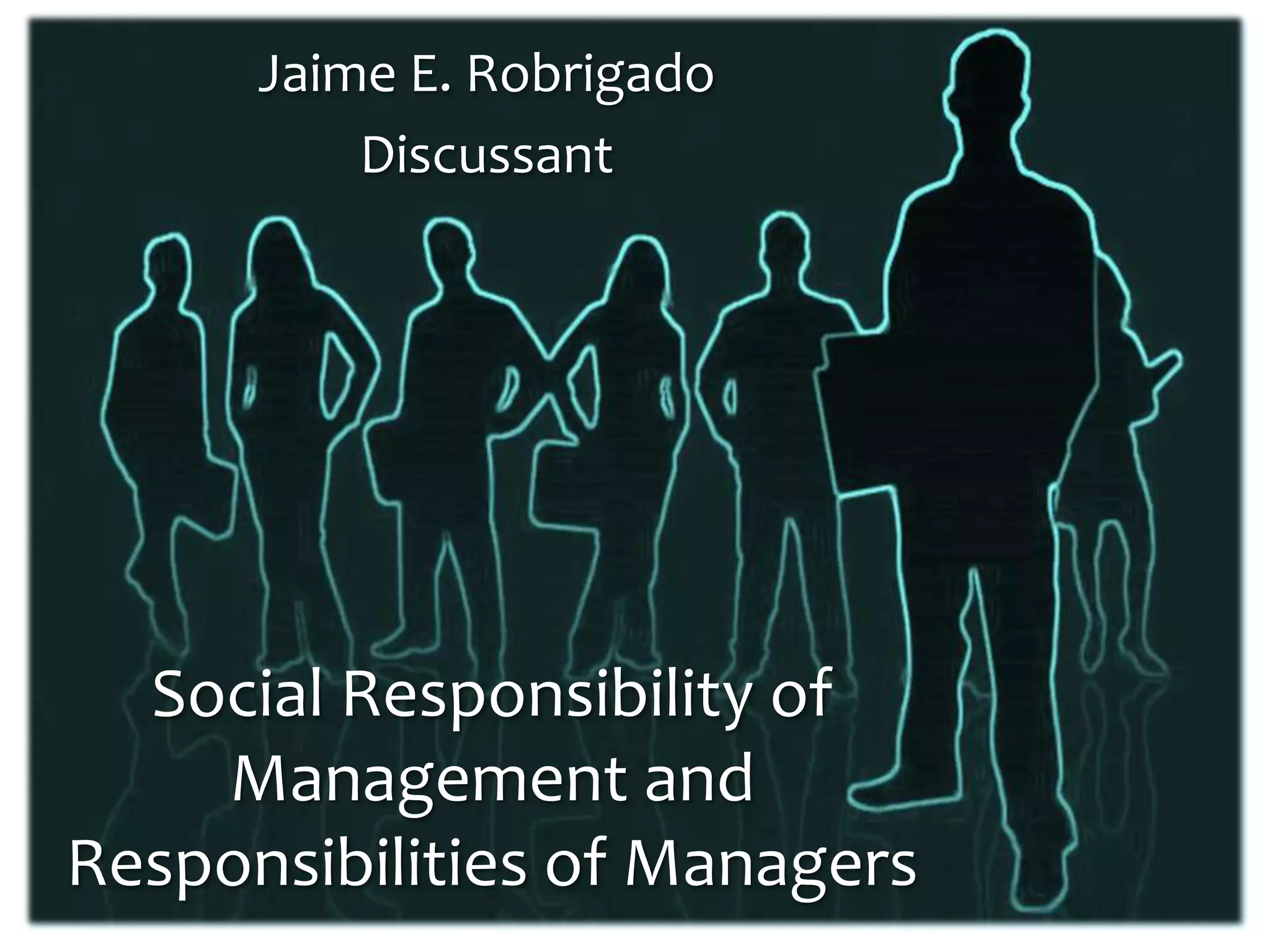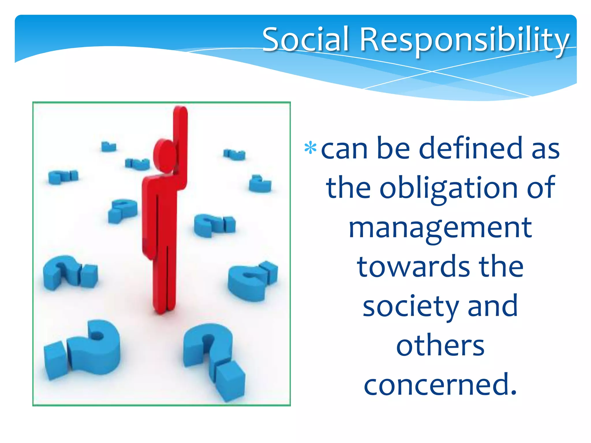 The document discusses the social responsibilities of management and managers. It outlines that [1] businesses are part of society and should respond to social demands, [2] fulfilling social responsibilities helps a business's long-term success and public image, and [3] as organizations within society, businesses should consider how their policies impact public welfare. It then details responsibilities towards owners, employees, consumers, government, and community, emphasizing fair treatment, ethical practices, and contributing to social stability and harmony.
