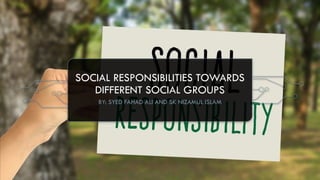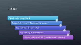 The document discusses social responsibility and its obligations towards various stakeholders, including shareholders, workers, consumers, and the government. It emphasizes the need for businesses to ensure fair returns for owners, provide meaningful work conditions for employees, offer quality goods and services to consumers, and adhere to legal and ethical standards while contributing positively to the community. The focus is on promoting trust, transparency, and respect across all relationships involved in business operations.
