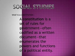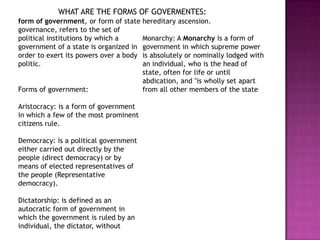 A constitution outlines the rules and powers of government, often in a written document. There are several forms of government including aristocracy, democracy, dictatorship, and monarchy. An aristocracy is ruled by prominent citizens, a democracy is ruled directly by citizens or through elected representatives, a dictatorship is ruled by a single dictator without hereditary rules, and a monarchy gives supreme power to a monarch as head of state. A state is a politically autonomous entity with internal and external sovereignty over a geographic area and population not dependent on any other power. This document was written by Andrea Carolina Franco Gallego for Diego Villamisar of the 5A class at Colegio Bilingue Richmond for the 2009-2010 school year.