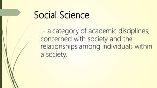 The document summarizes key concepts in social science, including definitions of history, economics, psychology, archaeology, anthropology, political science, and sociology. It then discusses theories on the origin of society, including conflict theory, structural-functional theory, and symbolic interaction theory. Finally, it outlines the evolution of humans from early hominids like Homo habilis to Homo sapiens, and the major periods in human prehistory such as the Paleolithic, Neolithic, Copper, Bronze, and Iron Ages.
