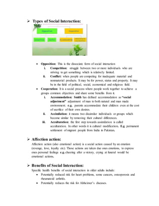 Social interaction is the process by which people mutually influence each other's attitudes, feelings, and actions through verbal and nonverbal communication. It occurs between individuals, between individuals and groups, and between groups. There are several types of social interaction, including opposition like competition and conflict, and cooperation like accommodation, assimilation, and acculturation. Social interaction provides health benefits such as reduced risk of heart disease, cancer, and depression. It also helps prevent issues associated with social isolation like feeling lonely, being less active, and increased health risks. Popular ways to socially interact include social media platforms like Facebook and WhatsApp.