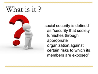 Social security is defined as security provided by society against certain risks like sickness, invalidity, maternity, old age, and death. It has two planks - social assistance which provides voluntary assistance to the poor and needy through public funds, and social insurance which involves pooling of resources through contributions from employees, employers, and the state to provide benefits as a right not proportional to contributions. The document then outlines the history and evolution of social security in countries like Germany, USA, and India as well as various social security schemes for different populations in India like industrial workers, civil servants, the general public, and specific schemes in Kerala.