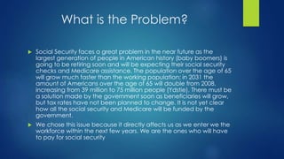The document discusses the challenges facing Social Security as the baby boomer generation retires. As life expectancy increases and more baby boomers retire, there will be fewer workers paying into Social Security to support the growing number of retirees collecting benefits. This will strain Social Security's finances unless changes are made. The document proposes examining data on Social Security's current state and future projections to develop a plan that would adjust the retirement age, benefits amounts, and payroll taxes to help ensure the long-term sustainability of Social Security.