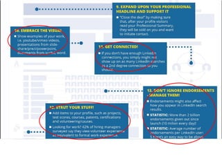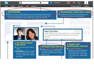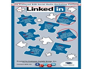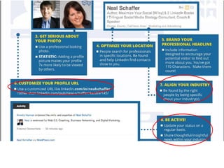 The document outlines strategies for optimizing LinkedIn profiles, engaging with prospects, and building professional connections. It provides six tips on effective networking, including the importance of complete profiles, targeted connection strategies, and crafting engaging in-mail communications. Additionally, it emphasizes the need to define success metrics for LinkedIn engagement and connectivity.