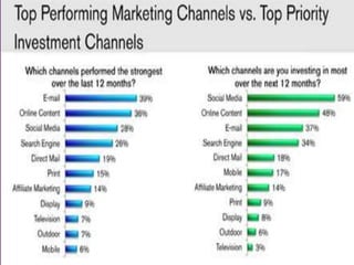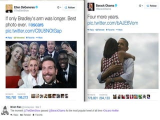 The document discusses the challenges of the modern digital environment, where individuals are bombarded with over 3,000 marketing messages per day and have very short attention spans. It emphasizes that visual content is processed much faster than text by the brain. It also provides tips for defining the target audience through research, setting goals for social media campaigns, and suggesting different types of social media content like photos, videos, and infographics.