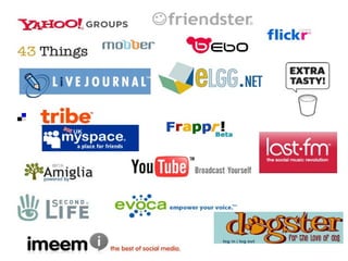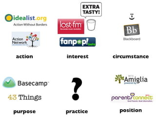 Social software supports group interaction through conversational interaction between individuals or groups, social feedback mechanisms, and tools to manage social networks and help build new relationships. Communities form around shared interests, practices, actions, purposes, circumstances, or positions, and involve groups who interact regularly to learn and improve at something they are passionate about. Characteristics of useful social software and websites include doing a single thing well, simplicity, syndication, hackability, participation, open content, prioritizing sharing over protection, addressing long tail interests, leveraging network effects and collective intelligence, incorporating human language and voices, and allowing for emergent behaviors, classifications, and perpetual beta testing.