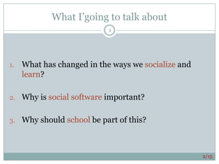This document discusses how socialization and learning have changed due to new technologies and the rise of social software. It describes how relationships have shifted from tightly-knit local communities to loosely connected global networks. Social software like blogs, wikis, and social media allow learning to become more social and collaborative as people interact and share knowledge online. The document argues schools should embrace these changes and find ways to bridge online and offline experiences to help develop students' digital literacy skills.